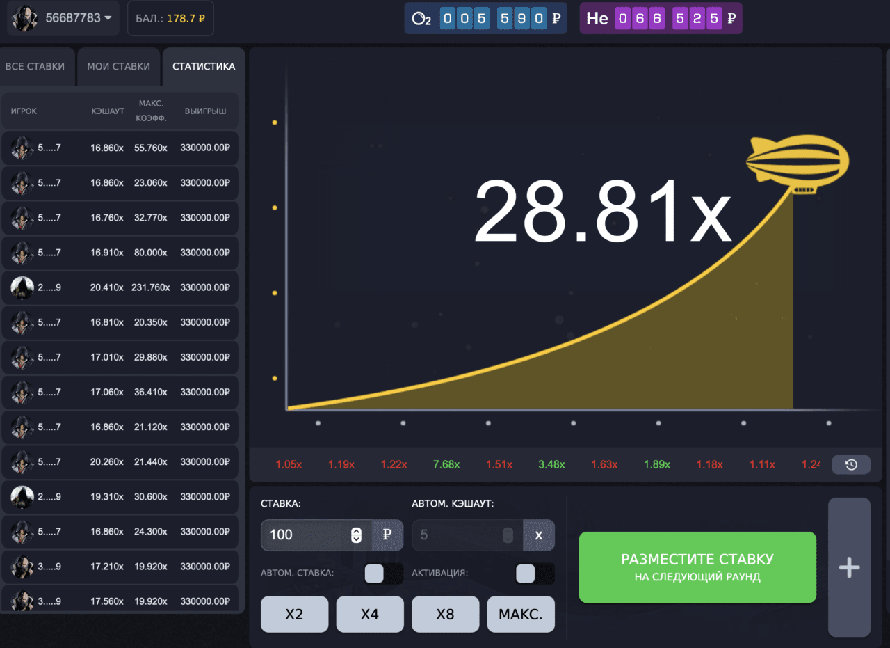 The player’s earnings depend on his skill, dexterity and more. “Airship” is integrated with a random number generator, which selects a certain number for each game round – the value of the multiplier. When it is reached, it stops. If the player does not have time to exit the transaction, the bet amount will be deducted from the account and will not be returned. Otherwise, the multiplier is applied to the wagered money. You should not look for logic in the game and try to detect any patterns. They simply don’t exist. The airship can stop both 1-2 seconds after the start of the flight, and after 30.