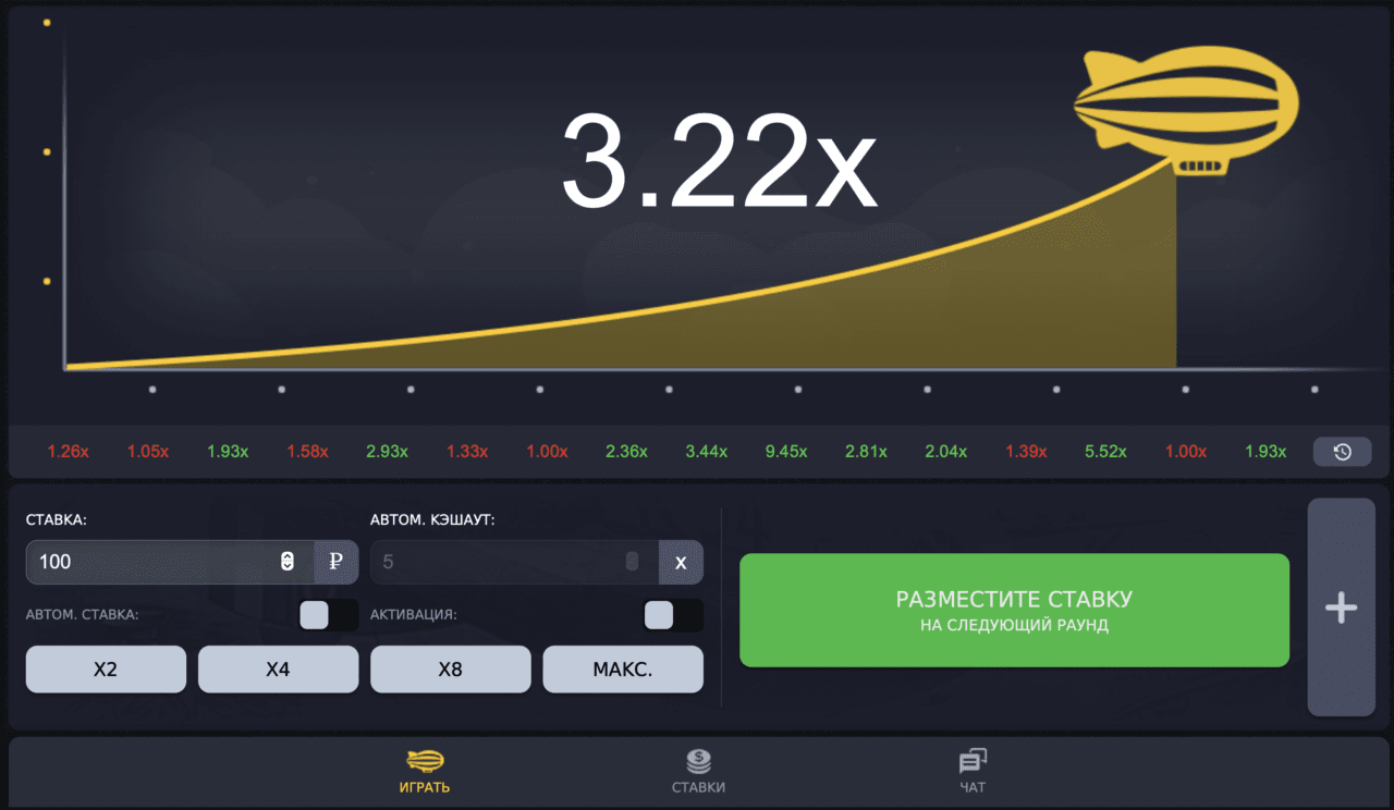 The player’s task is to follow the flight of the airship and the growth of the multiplier (the bet will be multiplied by it in case of winning). He must have time to leave the game before the moment when the aircraft stops moving.