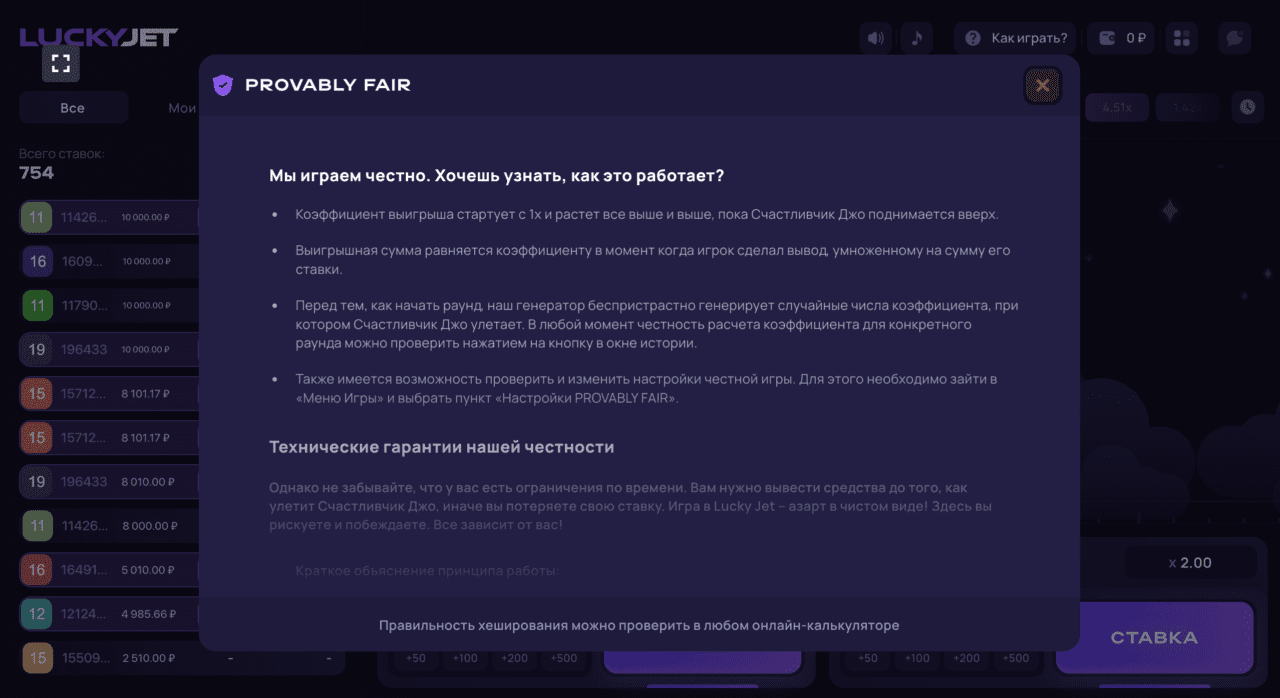 Особенность сводится к тому, что информация о ключе в зашифрованном виде сразу доступна игроку в меню настроек. Расшифрованный вариант можно увидеть после раунда. Так, Lucky Jet – это честная игра. Казино не может влиять на результаты вычислений, шифрования и т.д. Ни один заинтересованный игрок ни при каких обстоятельствах не изменит ход игры.